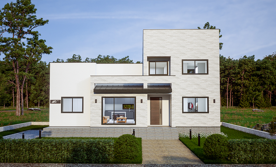 화이트 파벽돌 마감의 깔끔하고 현대적인 목조 주택으로 어두운 색 금속 지붕과 우드 패널 현관문이 포인트를 주며, 전면의 큰 창문으로 채광이 잘 될듯한 개방감이 좋은 주택입니다.