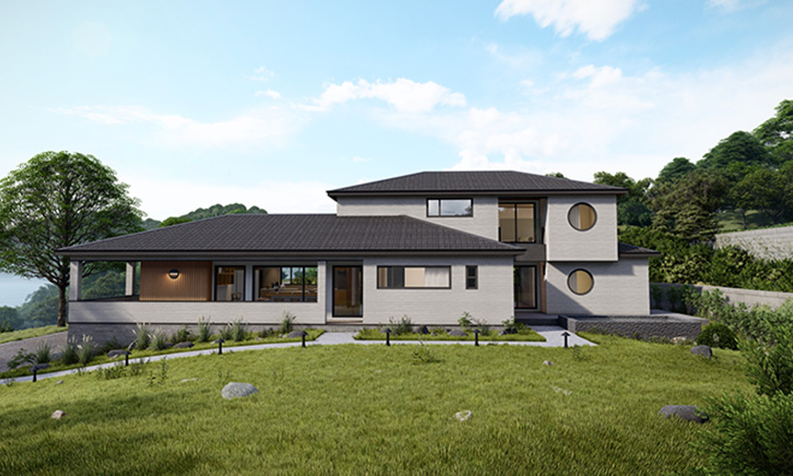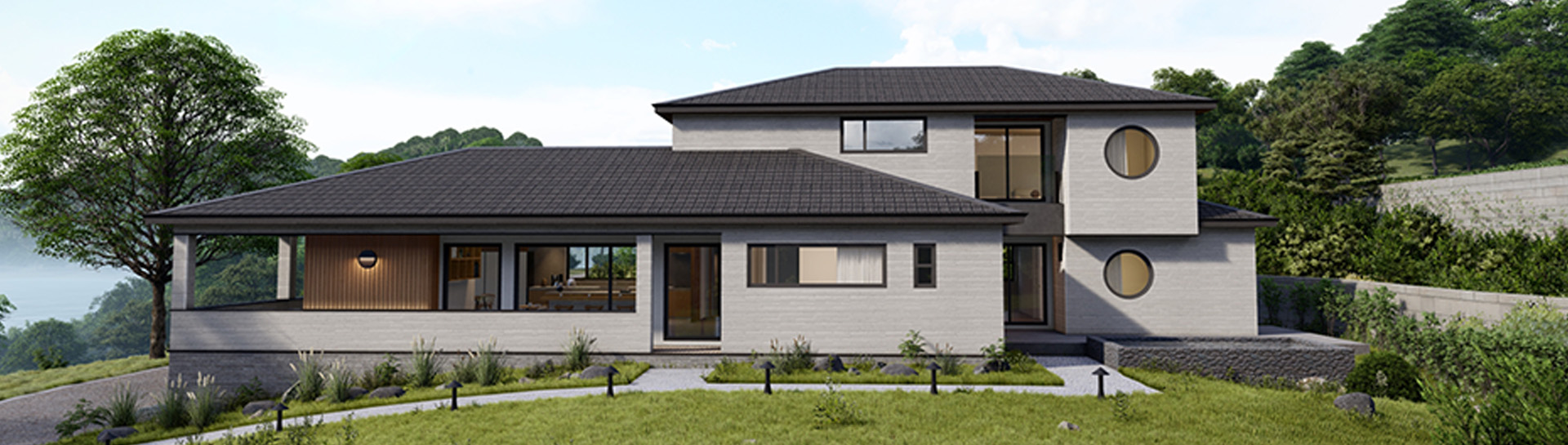 모던한 직선미와 원형 창의 포인트가 조화를 이루어 세련된 외관을 완성했습니다. 자연 속에 어우러진 밝은 톤의 외벽과 넓은 창은 개방감을 주며 풍경을 실내로 끌어들입니다.