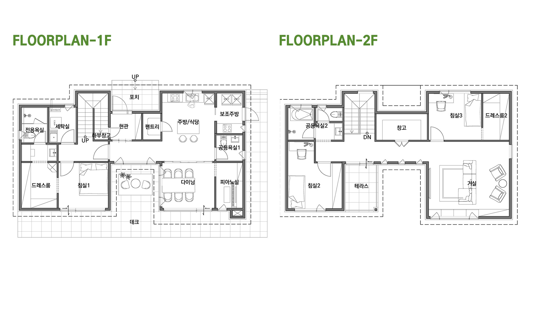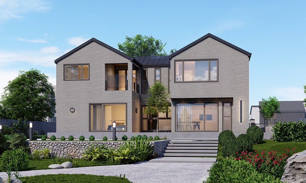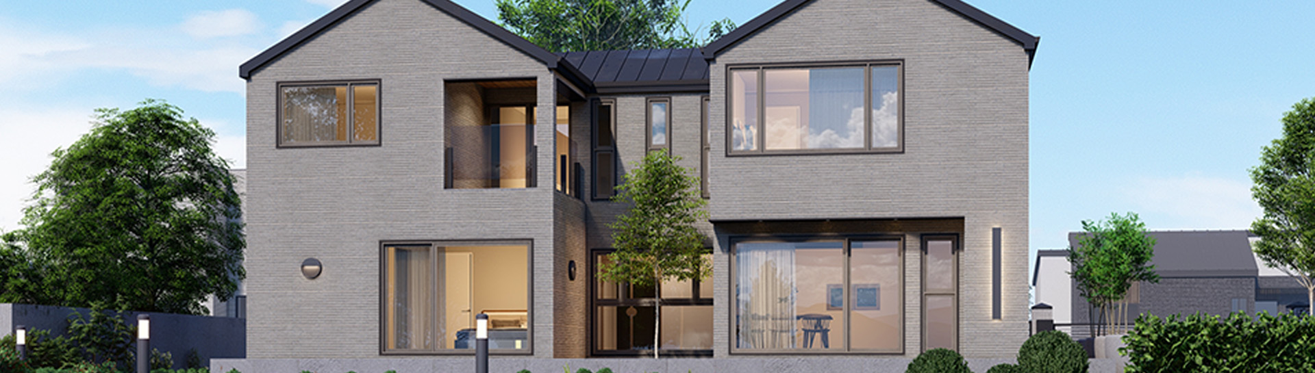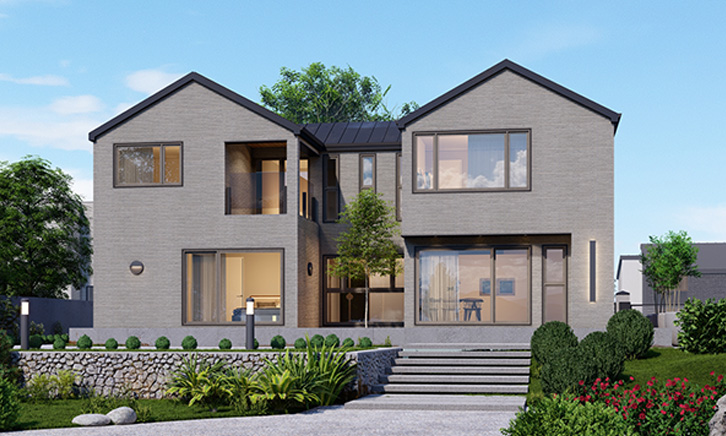 대칭적인 박공지붕 디자인이 안정감을 주는 모던 주택입니다. 차분한 그레이 톤 외벽과 넓은 창이 어우러져 세련되면서도 따뜻한 주거 분위기를 연출합니다.