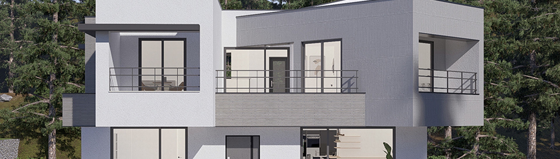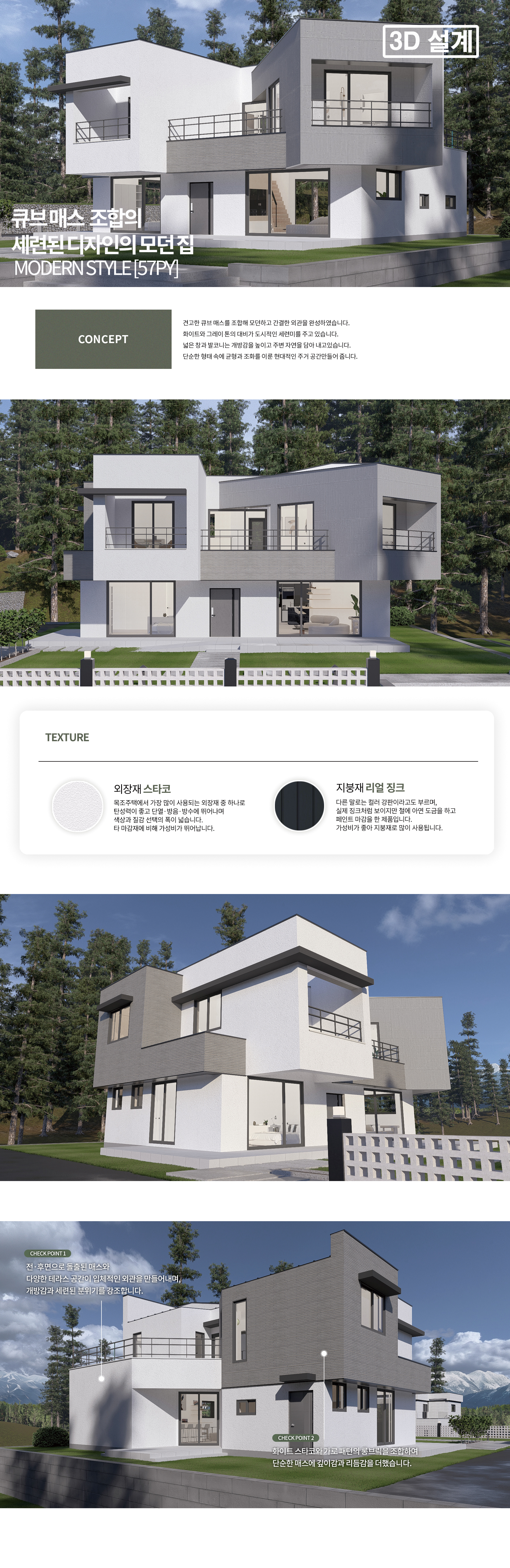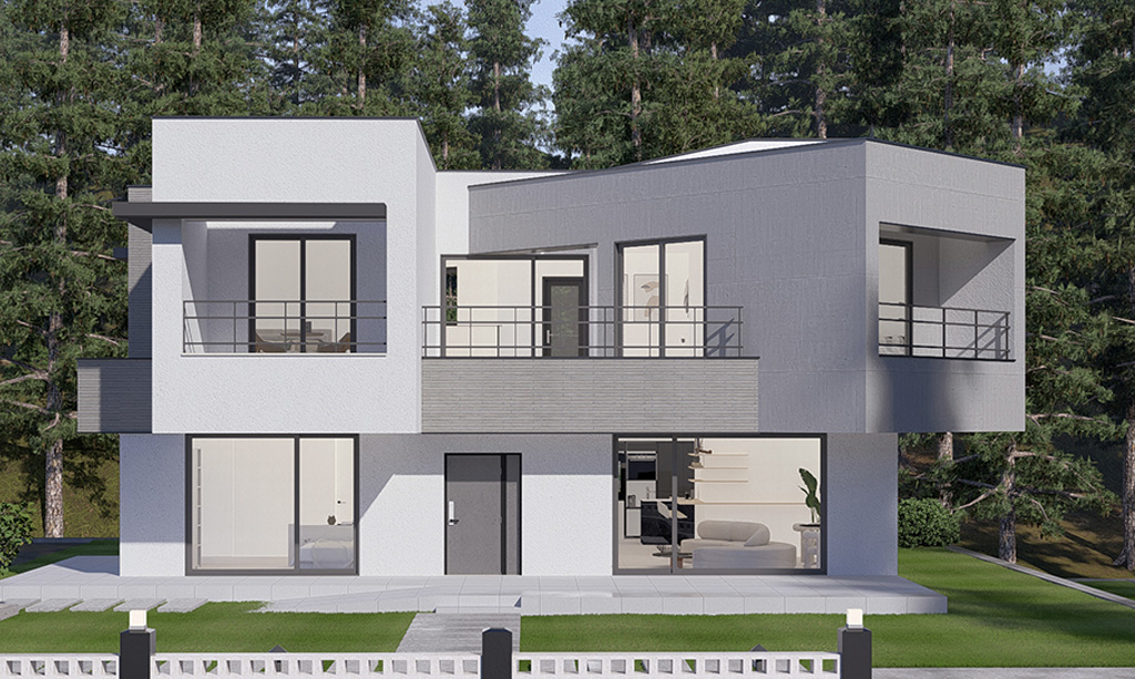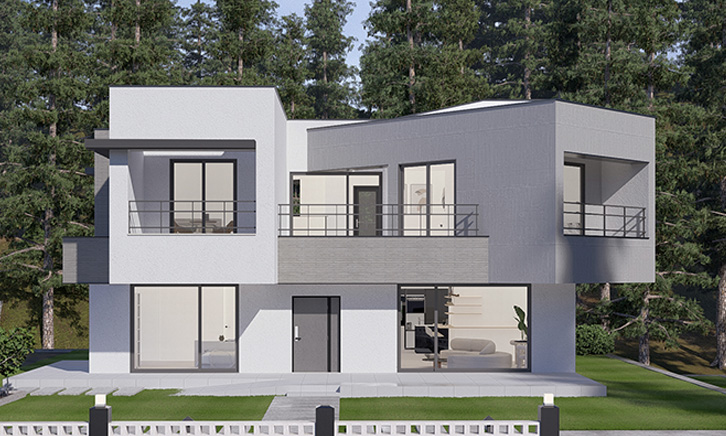 화이트와 그레이 톤의 조화로 세련된 모던함을 강조한 주택입니다. 직선적인 박스 구조와 넓은 창, 발코니 공간이 개방감을 주며 현대적인 라이프스타일에 잘 어울립니다.