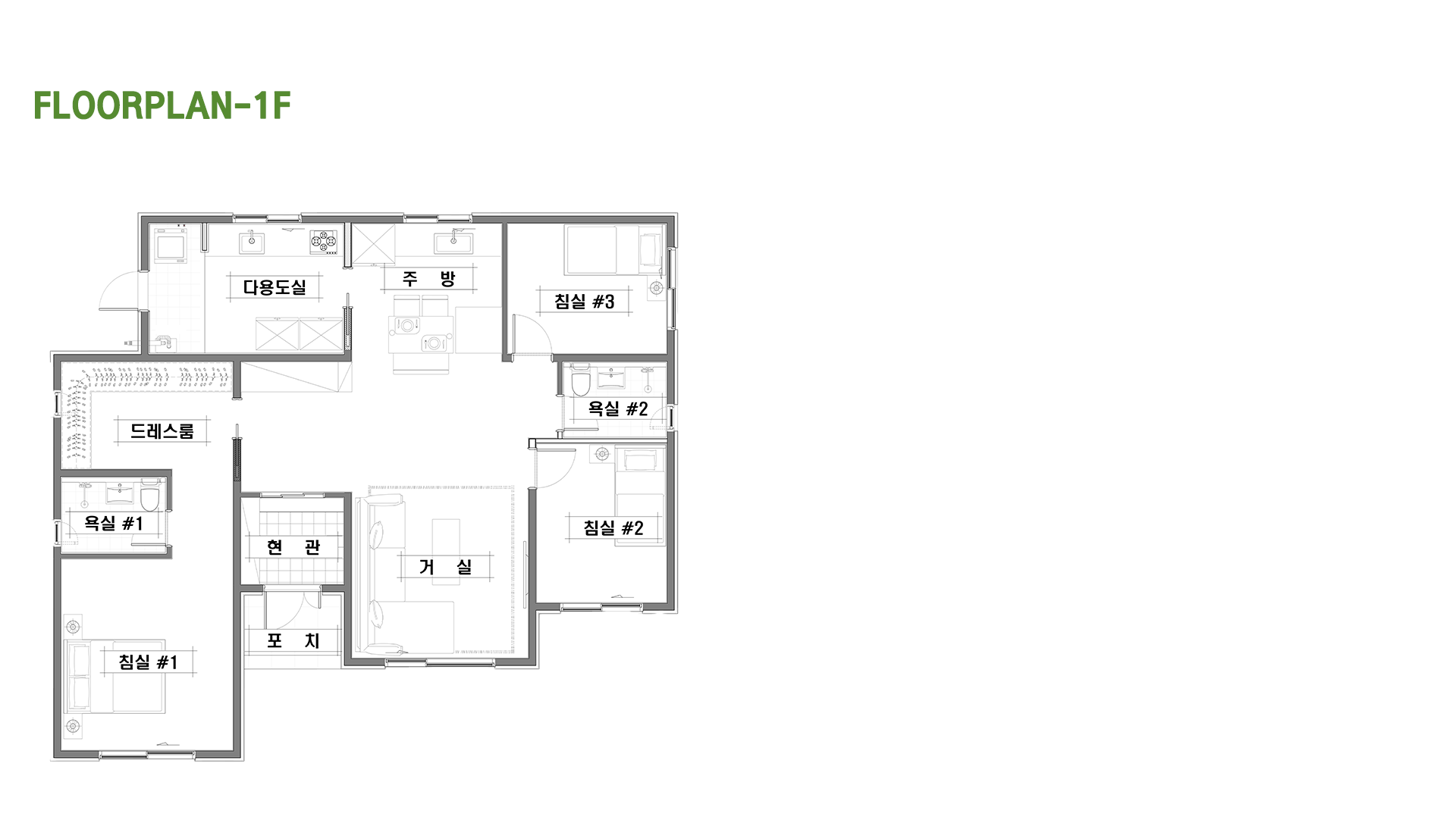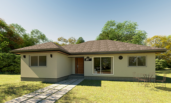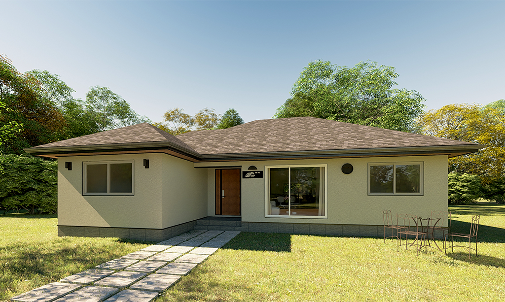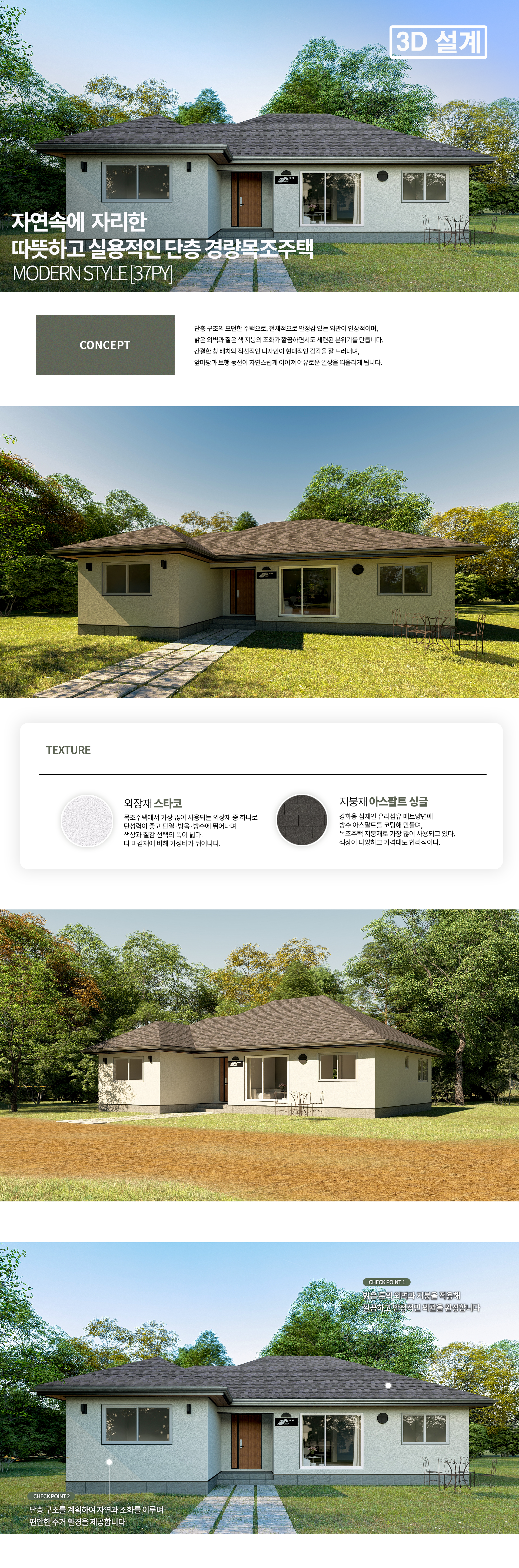 정갈한 화이트 스타코 외벽과 모임지붕이 조화를 이루어 단정한 미학을 강조한 경량목조주택입니다. 견고한 석재 데크와 아스팔트 슁글 마감으로 내구성을 더했으며, 창 너머로 펼쳐지는 푸른 풍경이 일상에 여유를 선사합니다.