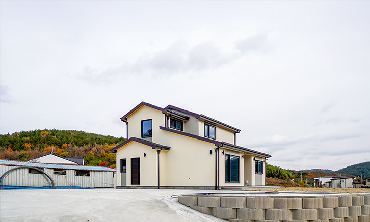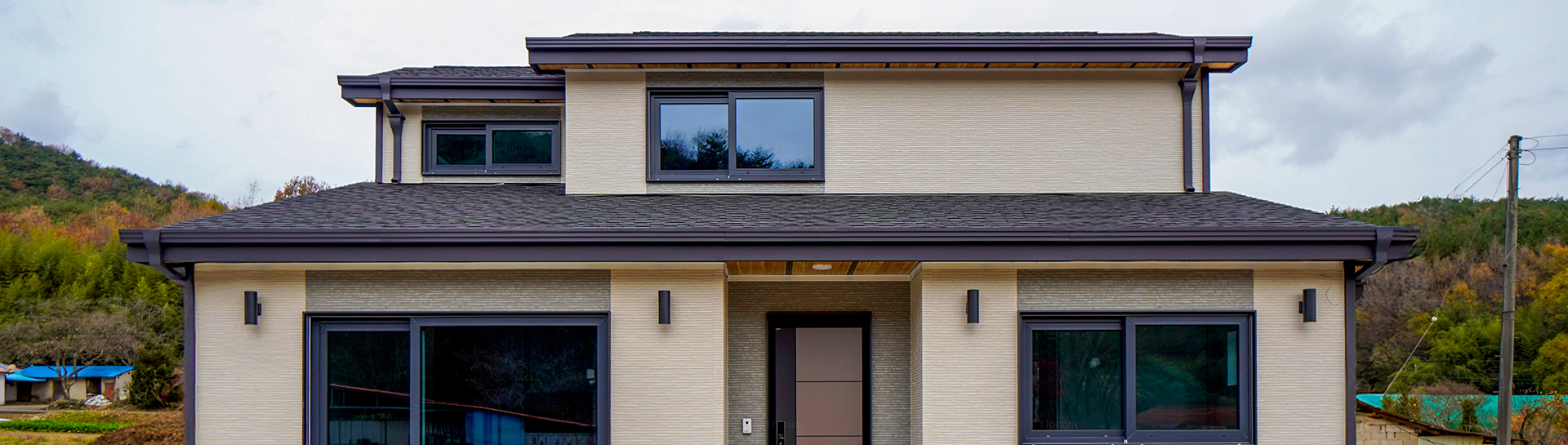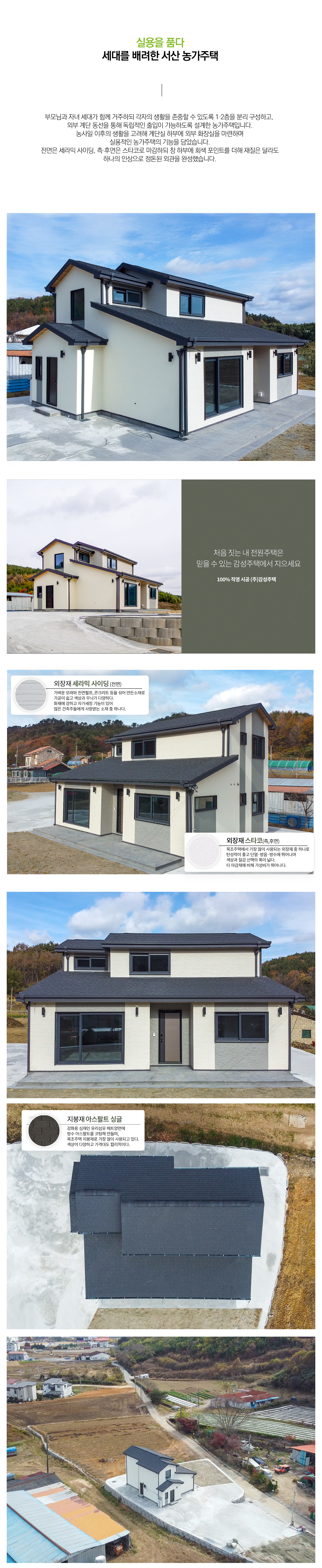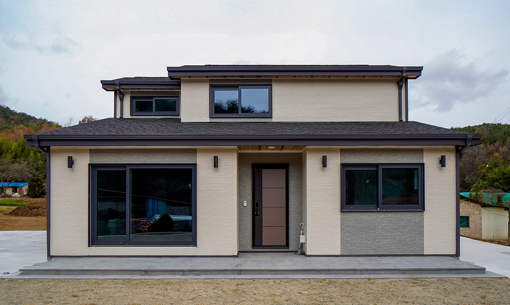 "하얀색과 회색의 세라믹 사이딩, 그리고 블랙 앤 화이트 스타코의 정교한 대비가 돋보이는 모던 스타일 경량목조주택입니다. 다채로운 질감의 외벽 마감이 입체적인 볼륨감을 형성하며, 견고한 석재 데크와 아스팔트 슁글이 조화를 이루어 단정한 미학을 완성합니다. 대형 창호 너머로 펼쳐지는 자연의 풍경은 현대적인 일상 속에서 깊은 여유를 선사합니다."