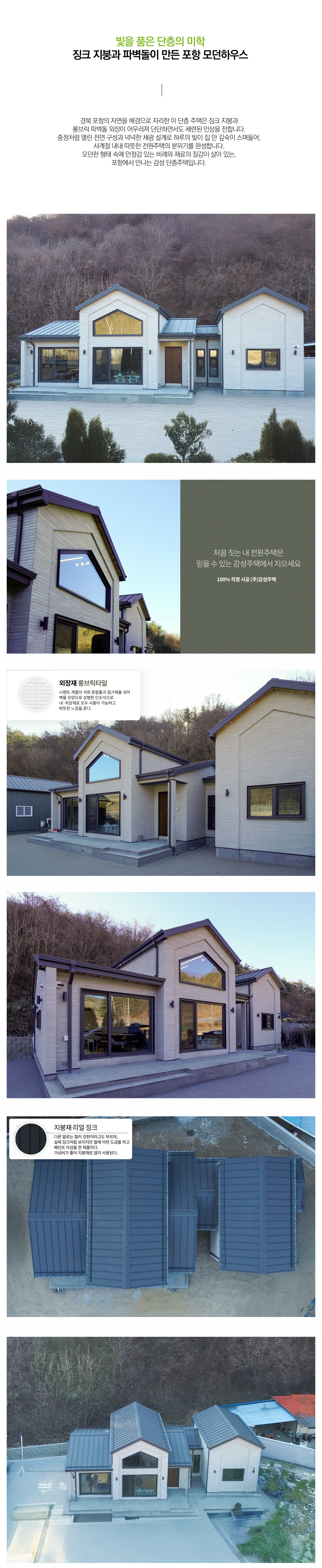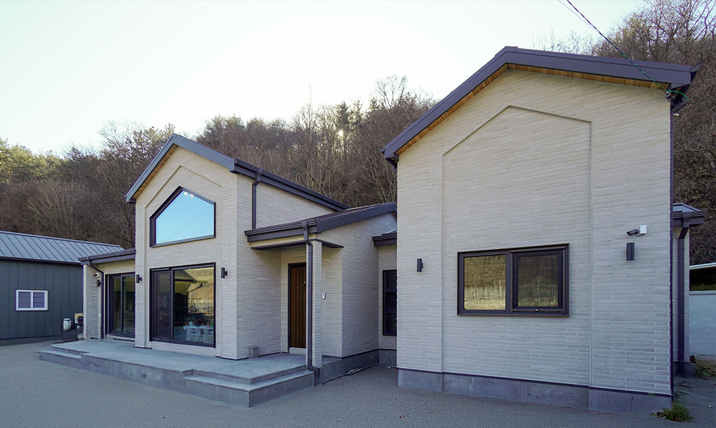 "중후한 리얼징크 지붕과 입체적인 질감의 파벽돌 외벽이 만나 숲의 풍경 속에 자연스럽게 스며드는 모던 하우스를 완성했습니다. 박공지붕의 리듬감을 살린 설계와 탁 트인 대형 개방창은 실내외를 하나로 연결하며, 석재 데크와 넓은 잔디 마당은 일상에 여유로운 쉼표를 더해줍니다."