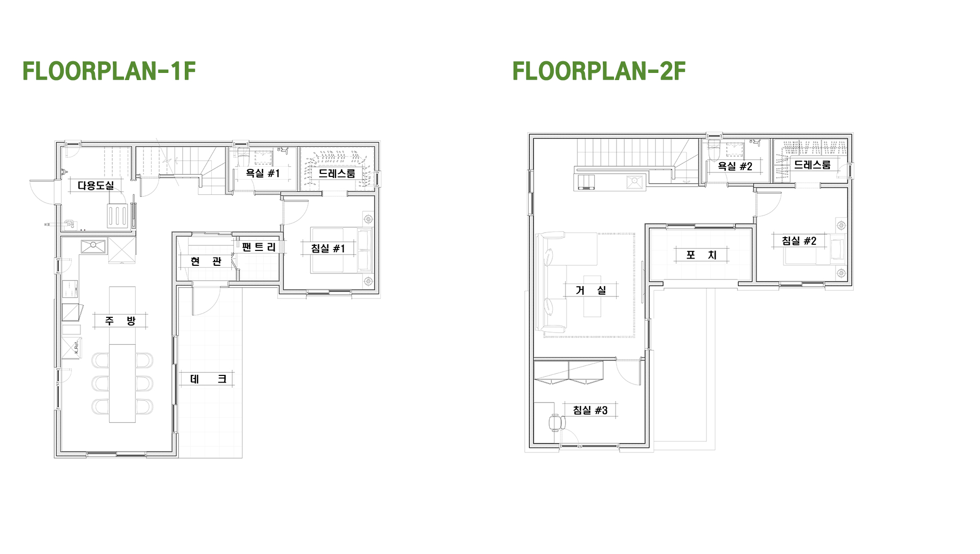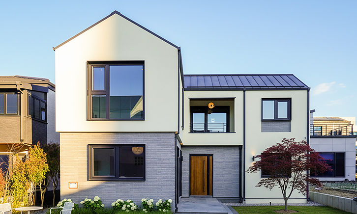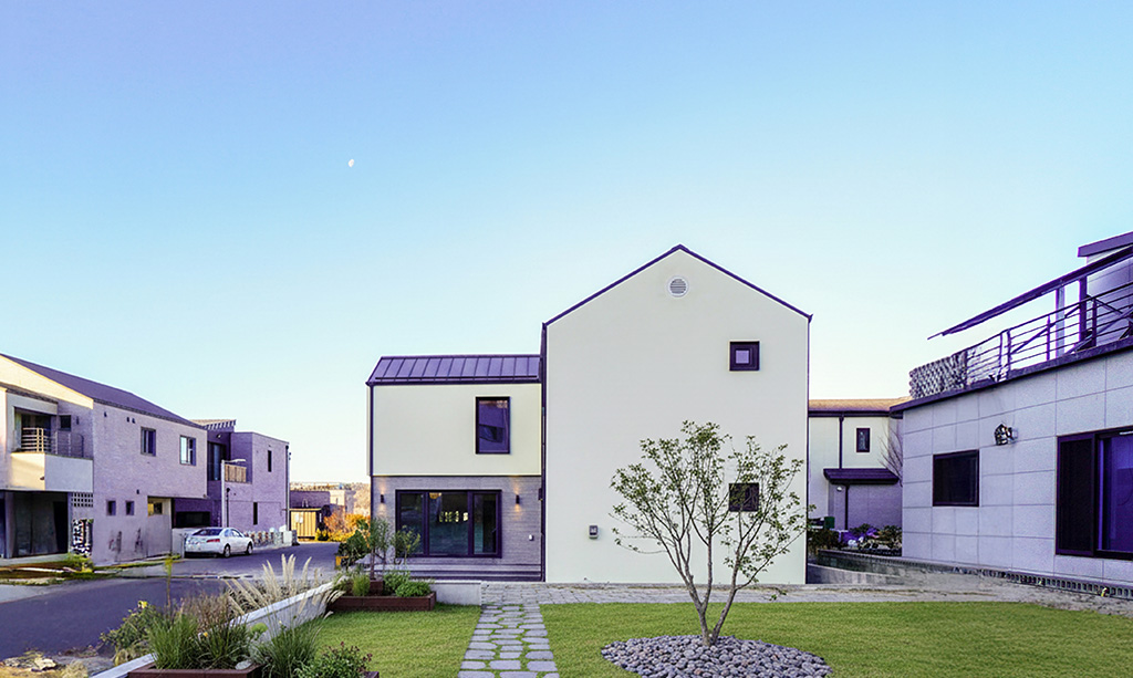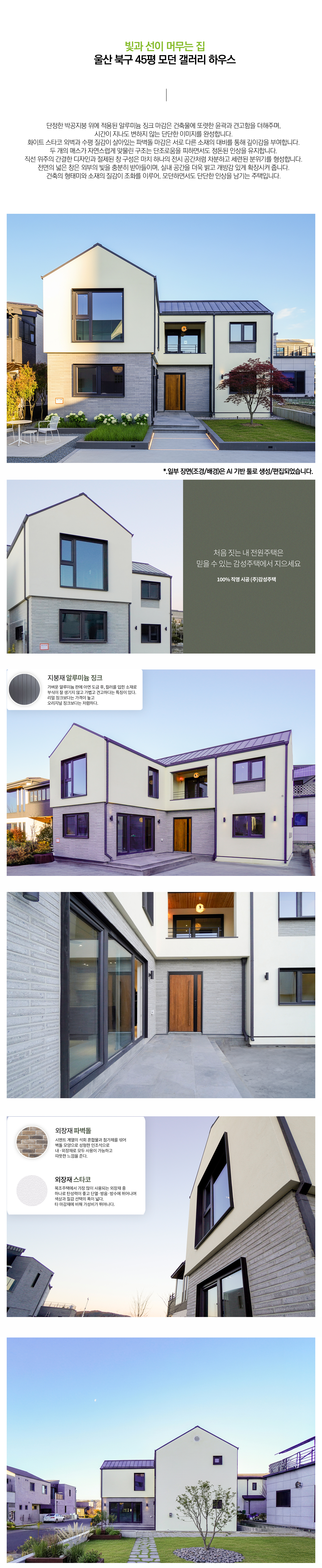 "견고한 알루미늄 징크 지붕과 깨끗한 스타코 외벽, 그리고 파벽돌의 질감이 조화를 이뤄 모던하고 단단한 외관을 완성했습니다. 석재 데크로 마감된 마당과 원형 타공 벽의 포인트는 건축물의 직선미를 더욱 돋보이게 하며, 넓은 창을 통해 자연의 풍경을 실내로 온전히 담아냅니다."