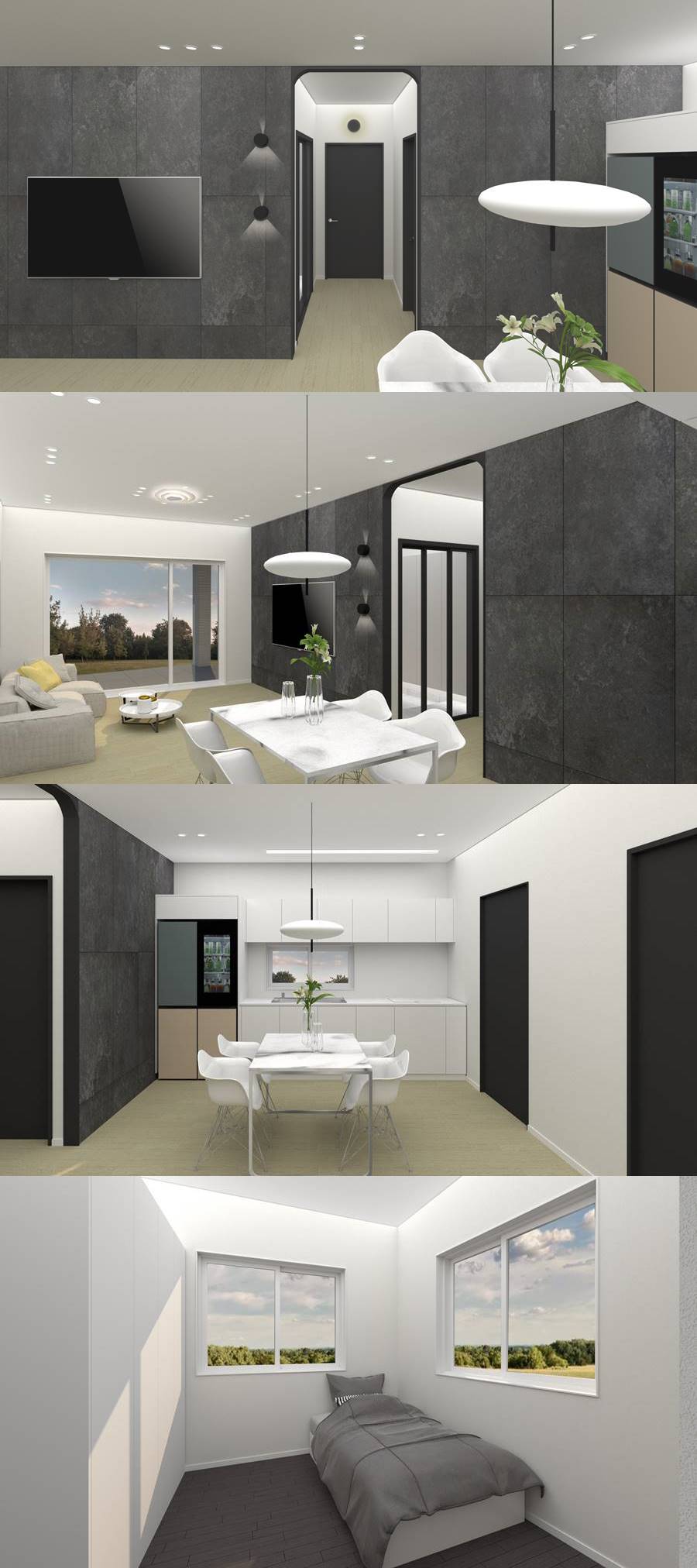 화이트 색상의 세라믹 사이딩 외장재로 심플하며 깔끔한 외관을 자랑하는 목조주택입니다. 정면의 큰 창으로 채광이 잘 되며 시원한 개방감을 주었습니다.